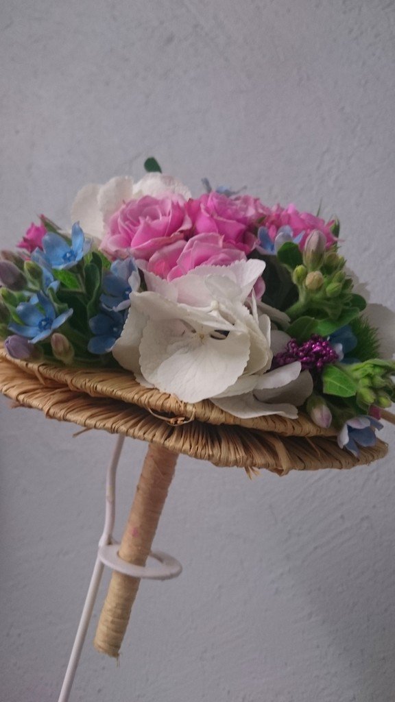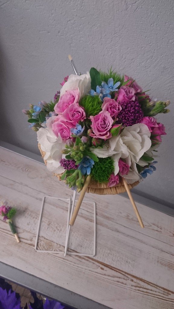 ce bouquet de mariée, unique, ressemble à une aquarelle, dans des tons très doux, et des pinceaux comme pour faire des retouches.